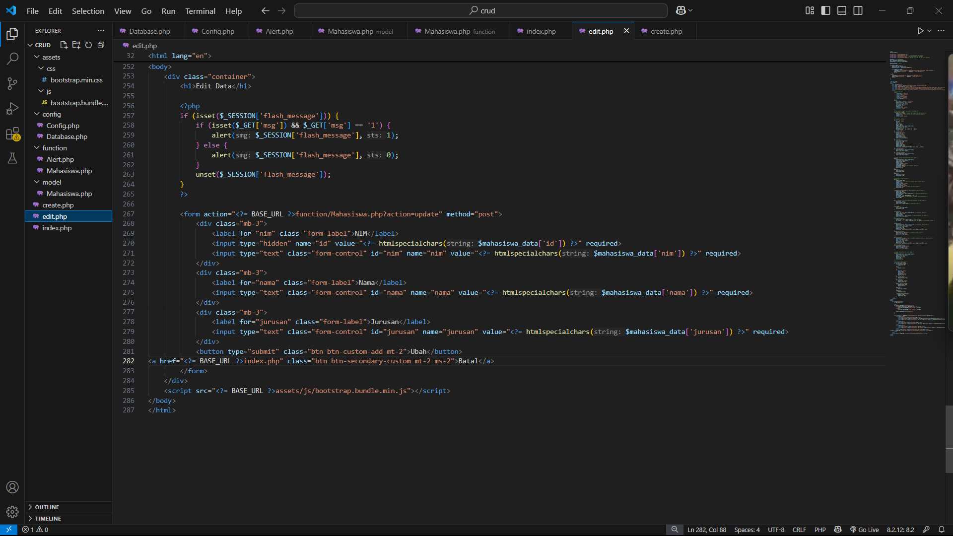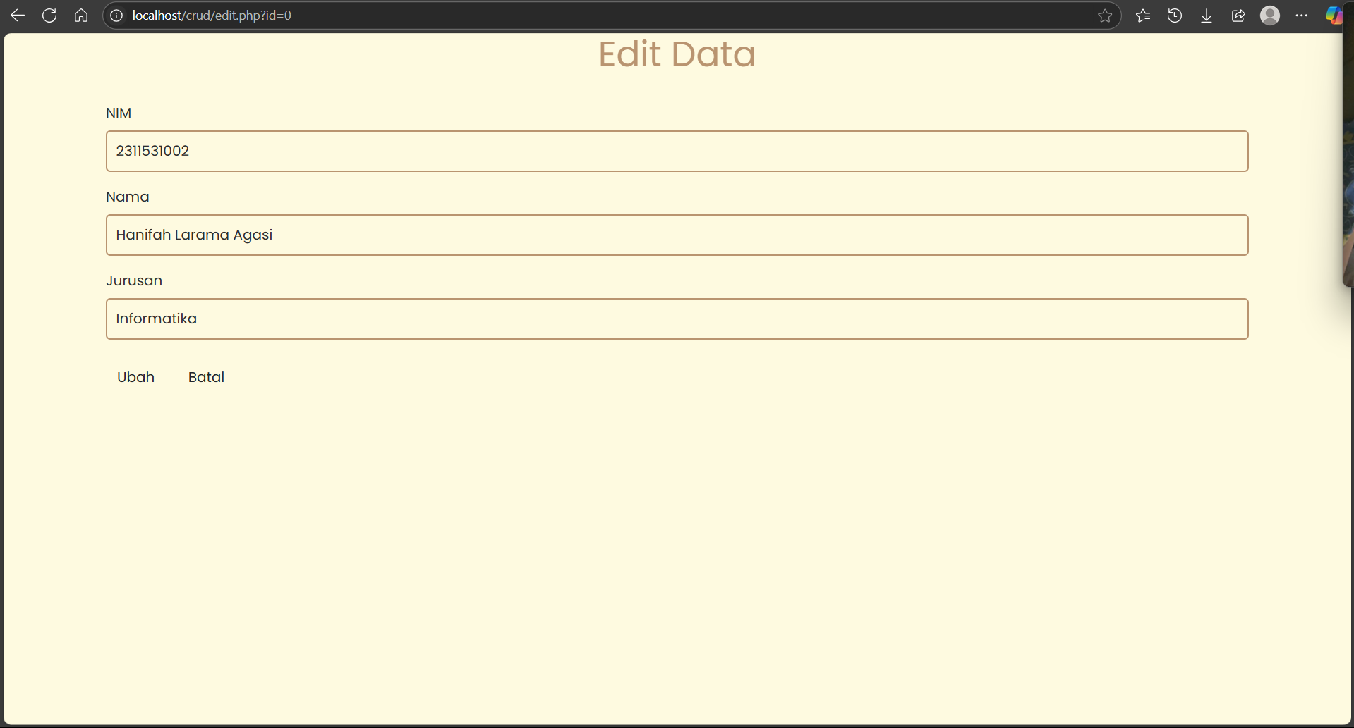10. Untuk menampilkan tampilan edit yang berguna untuk mengedit data mahasiswa yang sudah kita pilih