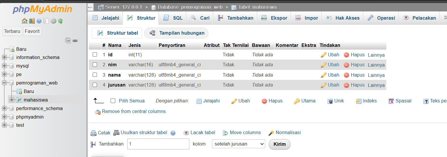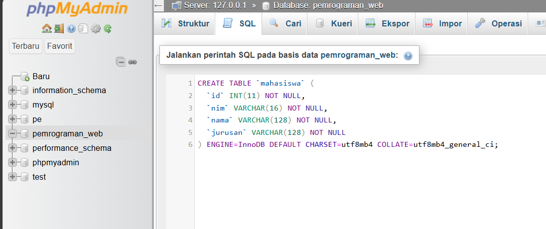 3. Buat database dengan nama pemrograman_web dan tambahkan id, nim, nama, dan jurusan.