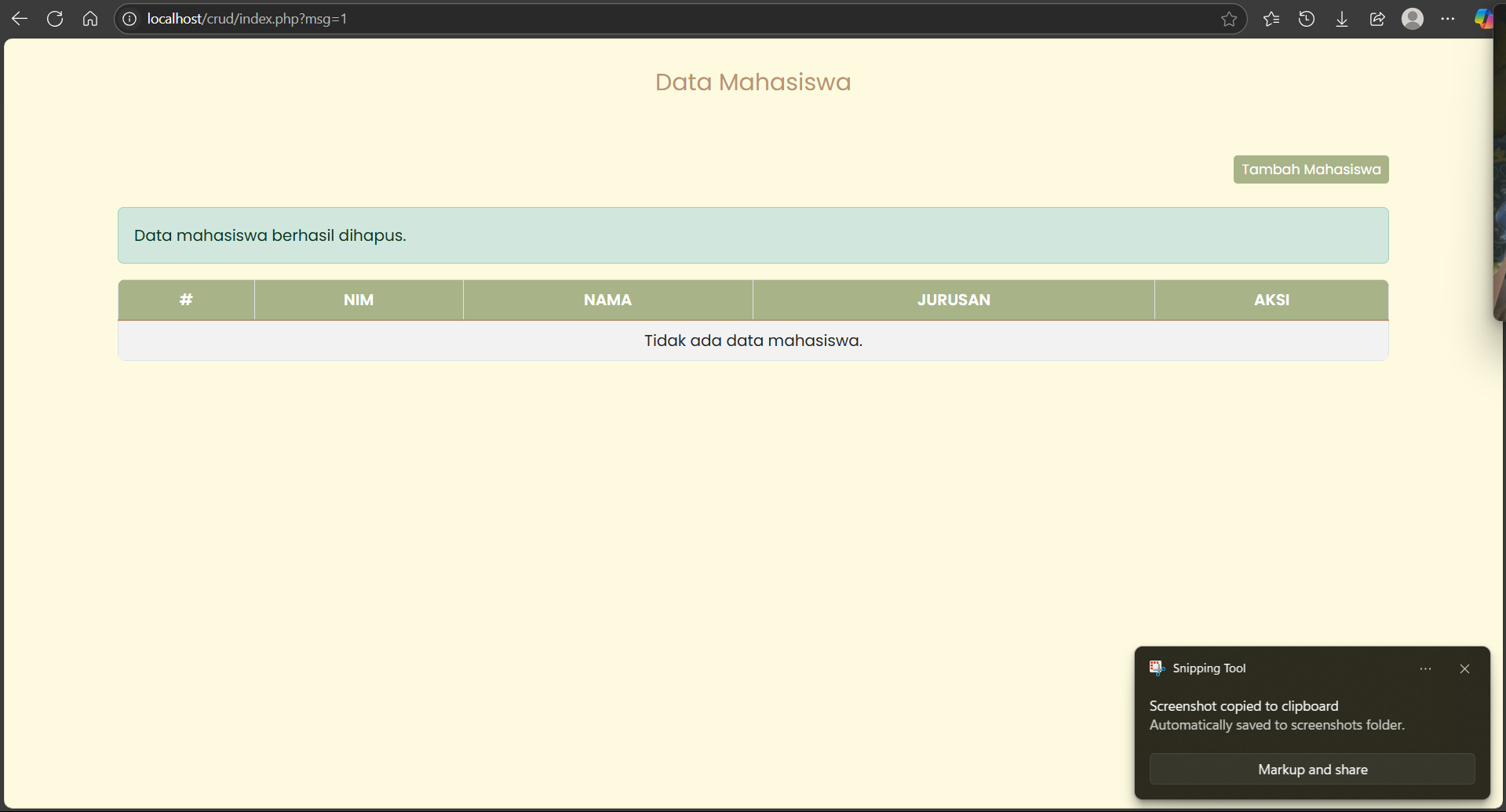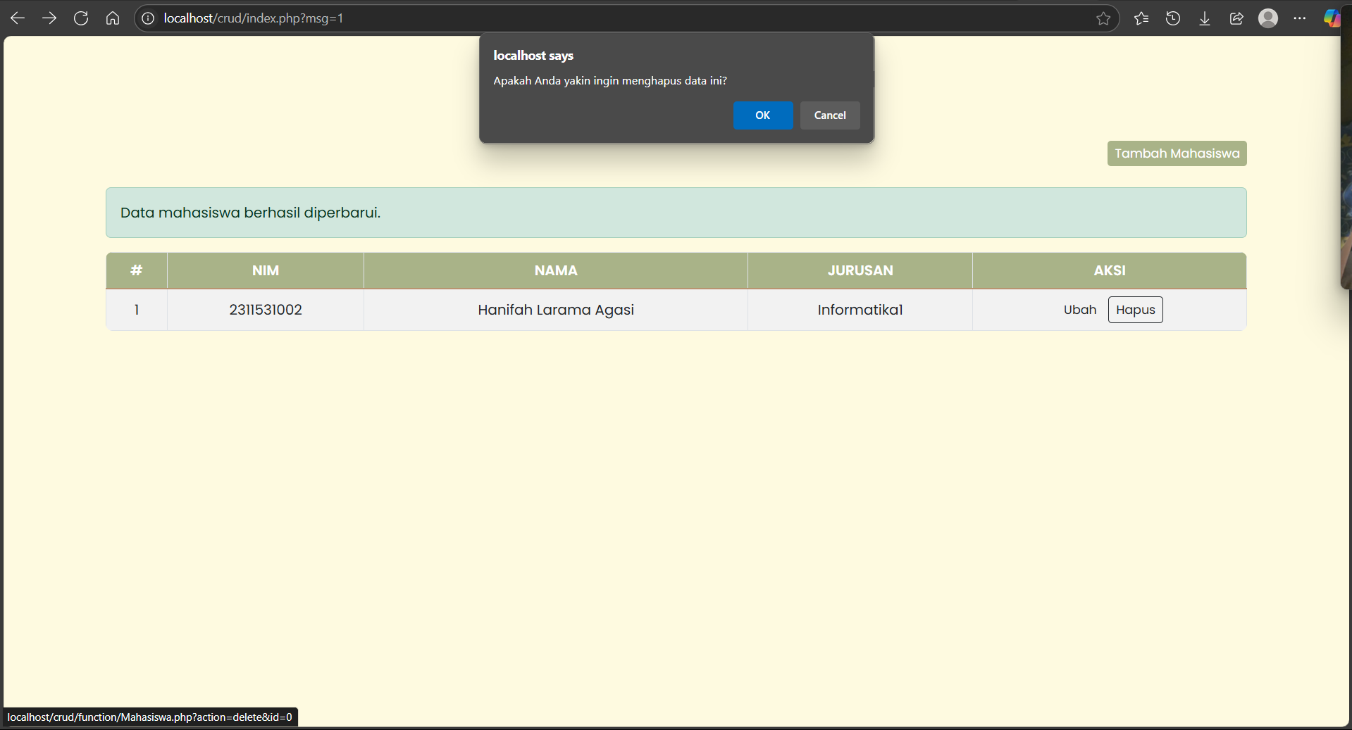 - Fungsi delete untuk menghapus data mahasiswa berdasarkan ID