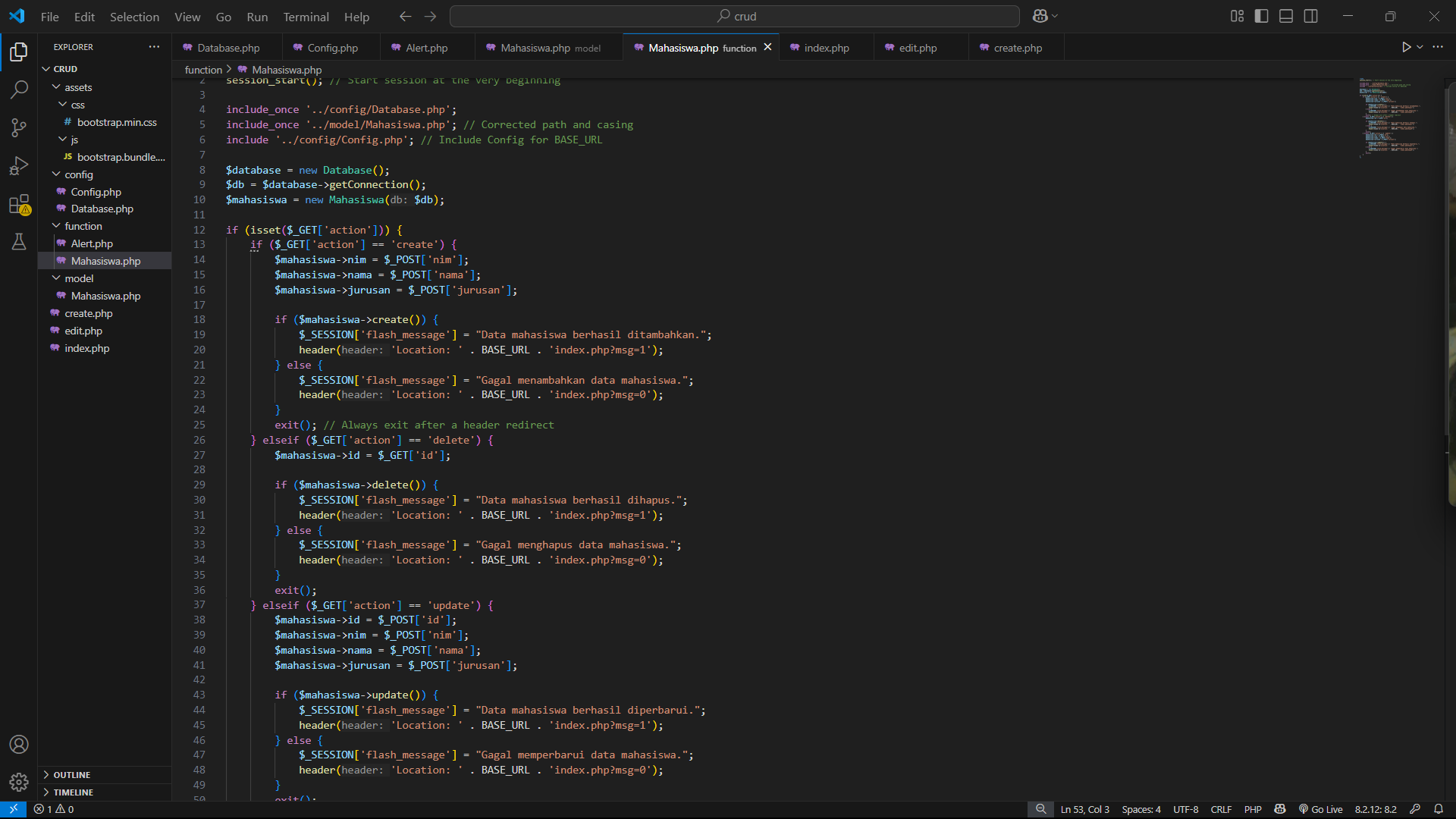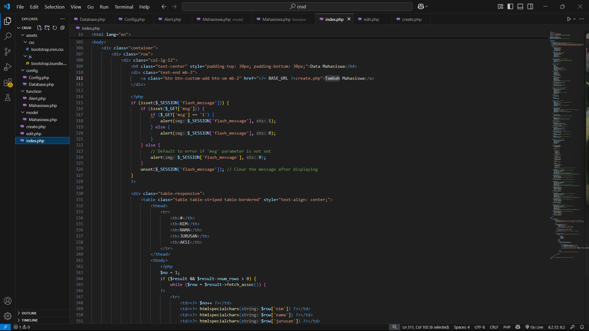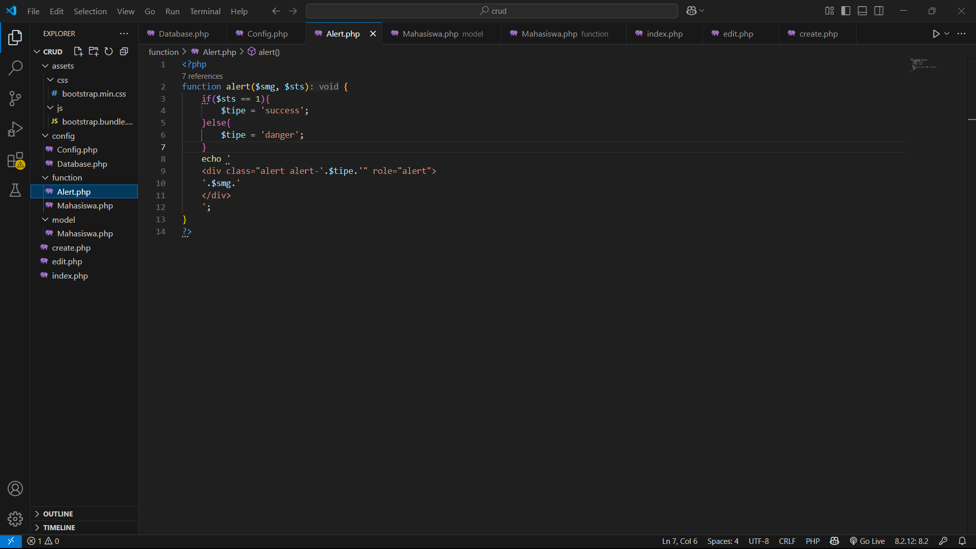 6. Selanjutanya buat file baru dengan nama alert yang fungsinya untuk membuat sebuah function yang berfungsi untuk menampilkan pesan Ketika melakukan operasi terhadap data, fungsi ini memiliki 2 buah argument statement yaitu $msg yang berisi pesan dan $sts yang berisi kode jika status 1 maka pesan berhasil dan jika 0 maka pesan gagal. Berikut kode program fungsi alert.